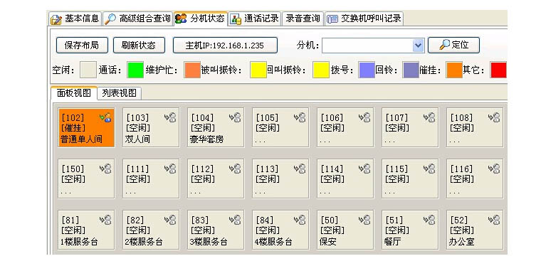 PC話務(wù)臺監(jiān)控界面可以很清晰的顯示所有外線以及所有分機(jī)的使用狀態(tài),移動鼠標(biāo)到分機(jī)圖標(biāo)上,可以顯示分機(jī)物理地址. 分機(jī)通話、響鈴、撥號等信息會以不同顏色配合文字顯示,操作員具此可以很方便的監(jiān)控到每個(gè)分機(jī)的使用狀態(tài)。