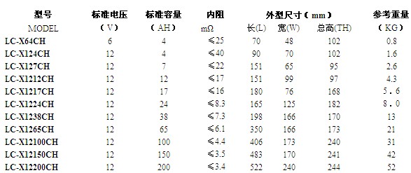 LC-X12V 24AH~100AH 系列鉛酸蓄電池特點(diǎn) 密封性:采用電池槽蓋、極柱雙重密封設(shè)計(jì),確保不漏酸??煽康陌踩y可防止外部空氣和塵埃進(jìn)入電池內(nèi)部。 免維護(hù):H2O 再生能力強(qiáng),密封反應(yīng)效率高,因此在整個(gè)電池的使用過程中無需補(bǔ)水或加酸維護(hù)。 安全可靠:特殊的密封結(jié)構(gòu),無酸液溢出,保證使用設(shè)備無腐蝕。防爆安全閥及其特殊結(jié)構(gòu)起防爆作用,使電池在整個(gè)使用過程中更加安全可靠。,充分保證了人和機(jī)安全,產(chǎn)品設(shè)計(jì)新穎美觀。 長壽命:計(jì)算機(jī)精設(shè)計(jì)的耐腐蝕鈣鉛錫合金板柵,克服了鉛鈣合金和普通低銻合金的早期容量衰減的缺陷,使電池的循環(huán)壽命和浮充壽命顯著延長。ABS耐腐蝕材料的使用和極高的密封反應(yīng)效率均保證了LC系列電池的長壽命。 性能高: 1、體重比能量高,輸出功率高。 2、充放電能力強(qiáng):同于采用獨(dú)特新型合金生產(chǎn),使本產(chǎn)品的電池內(nèi)阻極小,充放電能力強(qiáng)。 3、內(nèi)阻小,大電池放電性能好。 4、采用高純度原材料,嚴(yán)格加工工序生產(chǎn),將雜質(zhì)污染降到最低,使得電池的自放電控制在每個(gè)月3%以下(20℃)。 5、無需均衡充電,由于單體電池的內(nèi)阻、容量、浮充電壓一致性好,因此電池在浮充使用狀態(tài)下無需均衡充電。 6、溫度適應(yīng)性強(qiáng):可在-30~50℃下安全、放心地使用。 7、使用簡便:滿荷電出廠,無游離電解液,電池可橫向放置。 8、經(jīng)濟(jì)實(shí)惠:LC系列電池極高的性能,超長的使用壽命,極低的維護(hù)成本確保用戶得到的是最經(jīng)濟(jì)實(shí)惠的產(chǎn)品。 9、綠色環(huán)保無污染:無漏液、無腐蝕,回收方便,不污染環(huán)境。