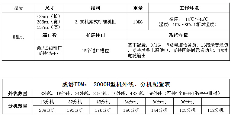 威譜TDMx-2000H為標準19英寸機架式安裝,符合目前大多數(shù)用戶希望設備安裝到機柜里的要求,設備約占4U不到的空間,外形時尚,做工精美。系統(tǒng)共提供15個通用槽位,可任意接入8路模擬外線板、16路普通分機板、8路數(shù)字分機板、PRI數(shù)字中繼板等擴展板卡。