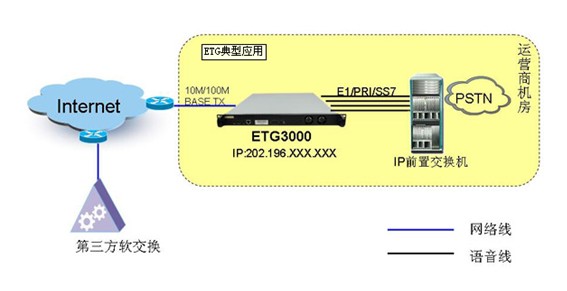 產(chǎn)品概述 ETG3000系列是一種數(shù)字中繼(落地)網(wǎng)關(guān), 嵌入式操作系統(tǒng), 采用標(biāo)準(zhǔn)的SIP/H.323協(xié)議,大容量電信級電話中繼網(wǎng)關(guān)功能, 支持2/4/8路E1/T1接口, 通過PRI/SS7與運(yùn)營商本地交換機(jī)對接, 主流廠家的軟交換系統(tǒng)互連互通。 產(chǎn)品特點(diǎn) 1、協(xié)議接口: 標(biāo)準(zhǔn)SIP 1.0/2.0;H.323 V4協(xié)議;PRI網(wǎng)絡(luò)側(cè)/用戶側(cè);SS7 TUP/ISUP協(xié)議 2、語音編碼: 標(biāo)準(zhǔn)G.711A/U,G.723,G.729AB.iLibc支持VAD(語音 抑制)、CNG( 舒適噪音產(chǎn)生)、JitterBuffer 和 EC 等語音質(zhì)量保障技術(shù),降低時延和失真 3、硬件接口: 采用兩路FE0/FE1以太網(wǎng)接口連接IP城域網(wǎng)中的L3/L2交換機(jī), 又稱"業(yè)務(wù)口"、"網(wǎng)管口", 多個E1/T1接口, 支持8個E1/T1接口, 支持2/4/8個E1/T1接口 4、兼容性高: 可以跟不同廠家的軟交換互連互通 5、電信級的局端接入設(shè)備: 多路由控制、時段控制、禁呼、通話數(shù)限制、號碼替換 6、安全性保證: 嵌入式系統(tǒng)可靠穩(wěn)定, 不受病毒侵?jǐn)_, 并提供良好的認(rèn)證機(jī)制, 保證用戶利益 7、熱備份: 雙電源的組合, 保證系統(tǒng)正??煽窟\(yùn)行 產(chǎn)品規(guī)格 尺寸(單位:mm) | 435×500×44 | 重量(單位:kg) | 6.5 | 工作溫度(單位:℃) | 0~40 | 存儲溫度(單位:℃) | -20~80 | 工作濕度 | 10%~90% | 功率(單位:W) | 40 | 電源輸入 | 85~265V AC, 50~60Hz, 1.2A | E1/T1數(shù)量 | 2/4/8 | 網(wǎng)絡(luò)接口 | 10/100BASE-TX | 控制口 | RS-232串口, 9600bps |