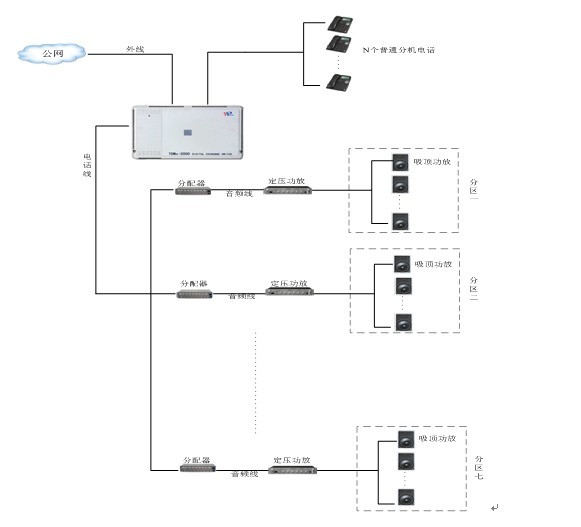 在每個(gè)車間分別安裝無源音箱,根據(jù)車間的面積大小確定音箱的數(shù)量,然后把每個(gè)車間的無源音箱分別接入功放,每個(gè)功放通過威譜廣播適配器實(shí)現(xiàn)和威譜交換機(jī)分機(jī)端口的連接;為每個(gè)廣播分機(jī)分配一個(gè)分機(jī)號(hào)碼作為廣播的號(hào)碼,內(nèi)部其它部門的分機(jī)只需撥對(duì)應(yīng)車間的廣播分機(jī)號(hào)即可方便進(jìn)行內(nèi)部廣播通知;如果單位領(lǐng)導(dǎo)在單位以外想對(duì)車間進(jìn)行廣播通知,只需要撥威譜交換機(jī)外線號(hào)碼,經(jīng)交換機(jī)電腦話務(wù)員,直接撥對(duì)應(yīng)車間的廣播號(hào)碼即可。