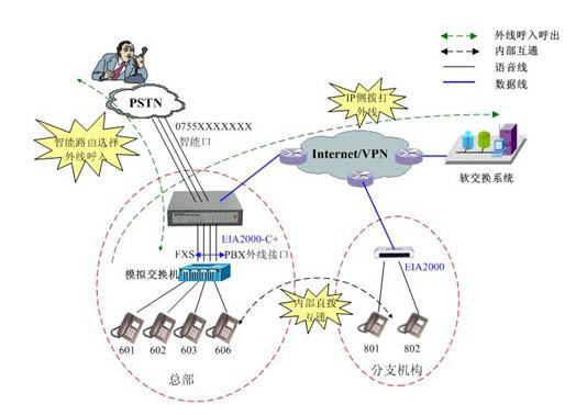 產(chǎn)品概述 終端EIA2008C+接入設備、提供8個Link口接PSNT線路, 8個FXS接普通話機, 可享受VoIP的低廉的資費, 優(yōu)質(zhì)語音, 支持斷網(wǎng)斷電不影響正常通話業(yè)務, 通過PSTN出局自動增加" IP "接入號, 同時提供4個LAN口實現(xiàn)企業(yè)辦公室交換機功能方便您上網(wǎng)服務。 EIA2008C+提供多方面的管理功能, 可對DHCP服務器、DMZ主機、靜態(tài)路由表、DNS、端口映射等進行管理, 同時提供全中文Web配置界面, 用戶界面友好, 配置簡單易用, 支持軟件升級, 是一款能讓您同時體驗語音和上網(wǎng)沖浪的首選產(chǎn)品。 產(chǎn)品特點 ? 支持T.38實時傳真,可以連續(xù)傳多頁紙,傳真清晰度高。 ? 支持主叫號碼、拍叉(用#代替)、呼叫轉(zhuǎn)移、熱線電話、FXS端口權限等多種實用的電話業(yè)務。 ? 話音質(zhì)量好,可以與普通PSTN話音相媲美.支持標準編碼如G.711、G.729A、G.723.1支持動態(tài)抖動緩 沖管理、回波抵消包補償技術、語音激活檢測技術VAD和舒適背景音生成(CNG)。 ? 支持802.1q和802.1p, 可以設置語音數(shù)據(jù)流的業(yè)務優(yōu)先級和VLAN標簽, 大幅提高業(yè)務的保護能力。 ? 內(nèi)置智能語音評判專家,在網(wǎng)絡狀況變差導致VoIP語音質(zhì)量下降時,能自動把呼叫路由到企業(yè)原PSTN 線路。? 撥號規(guī)則簡單靈活,與企業(yè)原有的傳統(tǒng)PBX電話互通性好,完全繼承傳統(tǒng)電話使用習慣。 ? 支持對VoIP與PSTN的呼叫比率進行控制,平衡VoIP運營商與企業(yè)原PSTN運營商之間的利益沖突。 ? 可以自動對長途呼叫添加類似17909的IP接入號。 ? 提供WEB圖形配置界面, 對設備進行本地配置, 操作管理、配置方法都非常簡單。 ? 通過串口或Telnet方式, 可以對設備進行本地或遠程監(jiān)控、診斷。 ? 支持軟件自動升級功能. EIA設備升級軟件時,不影響用戶的正常業(yè)務。 產(chǎn)品規(guī)格 尺寸(長×寬×高,單位:mm) | 440×280×43 | 重量(單位:kg) | 2.8 | 工作溫度(單位:℃) | 0~40 | 存儲溫度(單位:℃) | -20~70 | 工作濕度 | 10%~90% | 功率(單位:W) | 10 | 外置電源適配器 | 支持 | 電源輸入 | 220VAC/50Hz/0.5A | 外置電源輸出 | 12VDC/1.0A | 逃生FXO端口數(shù)目 | 8 | 產(chǎn)品規(guī)格 | 8S | 傳真支持 | 支持 | FXS反極信號發(fā)送 | 支持 | 斷電逃生 | 支持 | 電話接口雷擊保護 | 10/700, 4000V | 網(wǎng)絡接口 | 10/100BASE-TX | LAN口數(shù)目 | 4 |