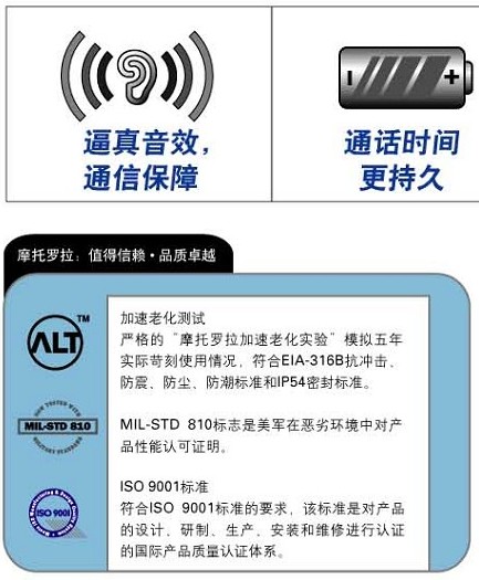 | 平均電池壽命 高容量鋰電池 超薄鋰電池 標(biāo)準(zhǔn)鎳氫電池 鎳鎘電池 | 高功率(4W) 14小時(shí) 12小時(shí) 10小時(shí) 8小時(shí) | 低功率(1W) 19小時(shí) 17小時(shí) 13小時(shí) 10小時(shí) | 密封 | 符合軍標(biāo)810C,D、E和F,通過IP54防雨實(shí)驗(yàn) | 沖擊和震動(dòng) | 機(jī)殼抗壓度符合軍用標(biāo)準(zhǔn)810-C、D、 E和F及TIA/EIA603 | 灰塵和濕度 | 機(jī)殼抗壓度符合軍用標(biāo)準(zhǔn)810-C、D、 E和F及TIA/EIA603 |